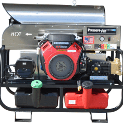 The 4000 PSI Hot Water Pressure Washer (Pro Super Skid 115V) is a fully self-contained commercial hot water pressure washer. Featuring a Honda engine, rugged frame, and 50 ft hose.